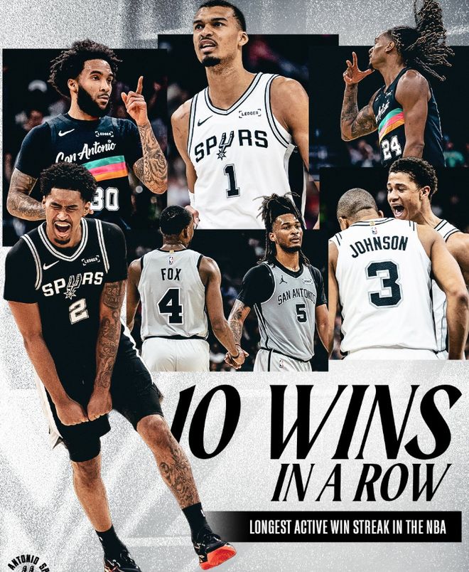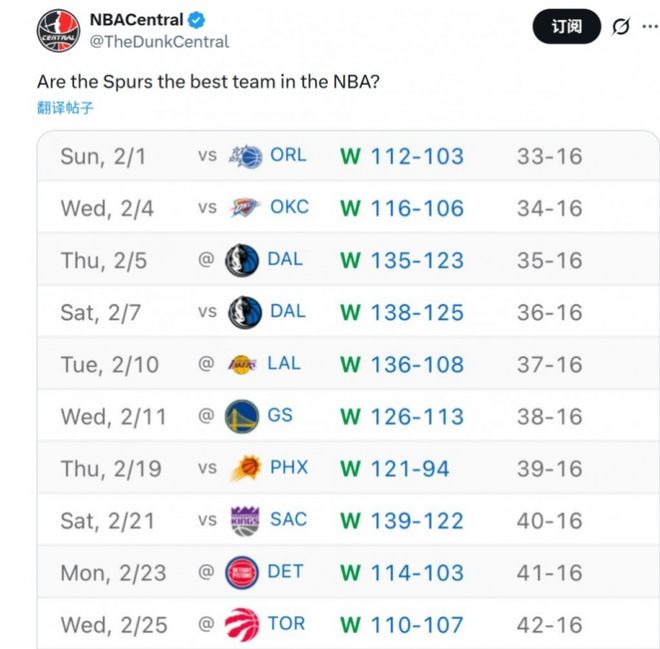 本场比赛,马刺一度落后多达15分,以78-90落后12分进入末节。但球队凭借深厚的底蕴强势反扑,末节打出32-17的悬殊攻势,单节净胜15分,最终马刺客场110-107逆转猛龙,豪取联盟现存最长的10连胜。同时,这也是马刺自15-16赛季之后的第一个10连胜,那个时候他们拿到13连胜。值得一提的是,明天马刺将对阵篮网,这是他们二月份最后一场比赛,如果不爆冷,马刺将在2月拿到11胜0负的战绩!赛后,美媒NBA Central晒出马刺最近10场的战绩,并发出灵魂拷问:“马刺是联盟最强球队吗?”
