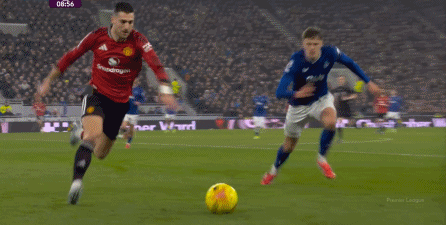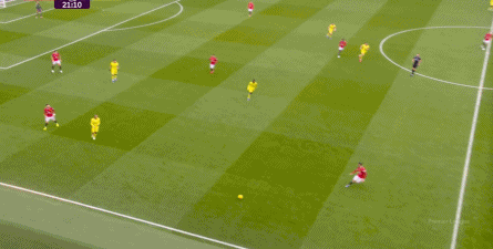 因为在此之前,比如没有约罗,但达洛特留在后场的时候,曼联其实也有失误的时候,包括在这场比赛,达洛特也曾在这次内收的时候高估了自己的技术: